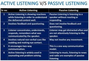 There are two kinds of listening: active listening and passive listening. The table below will help you comprehend the distinctions between them.